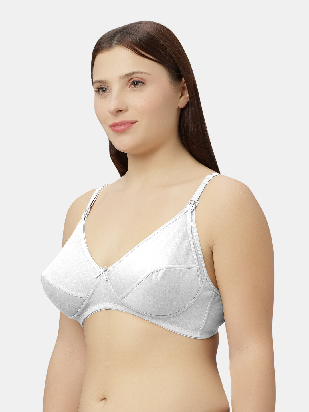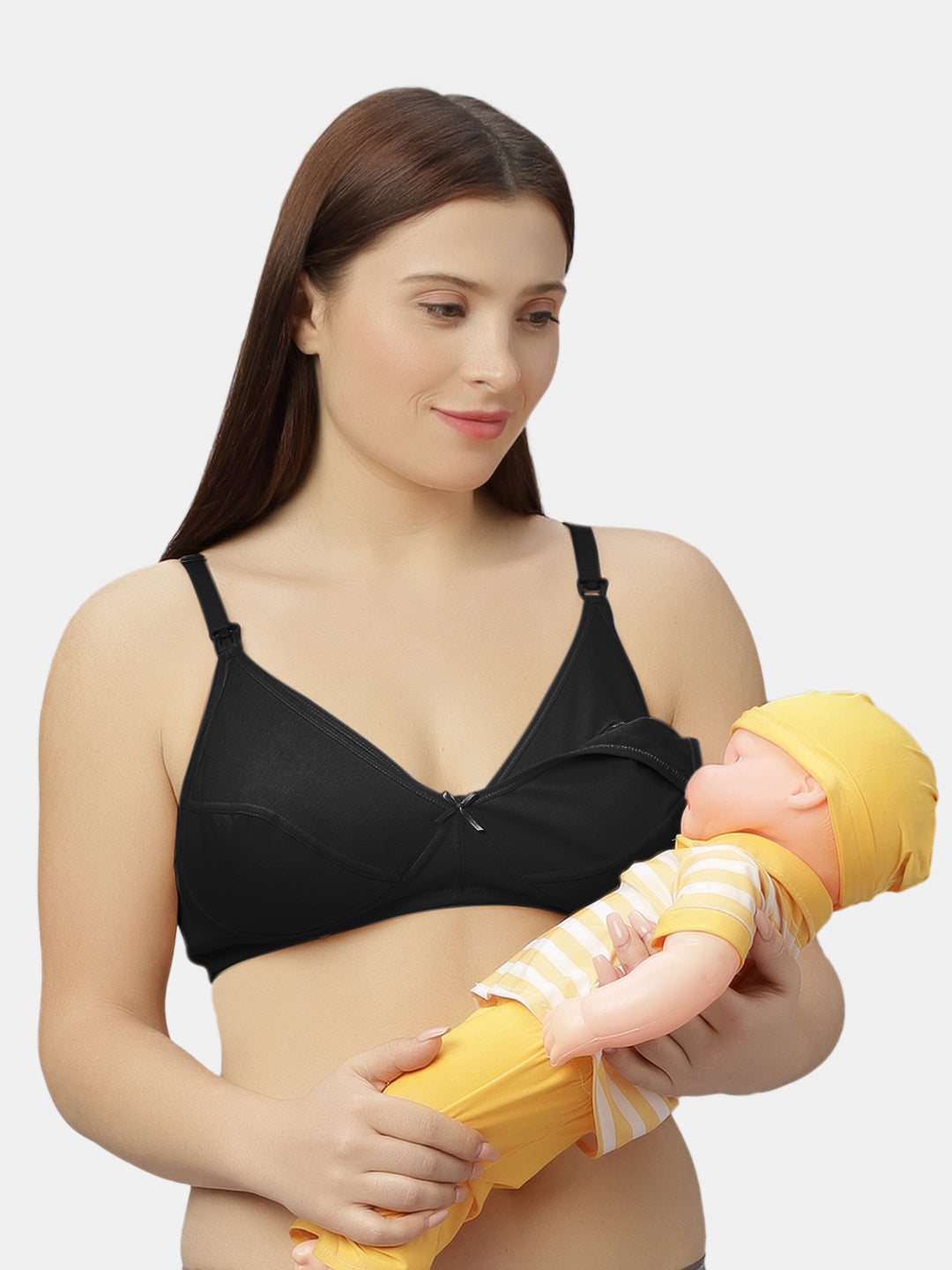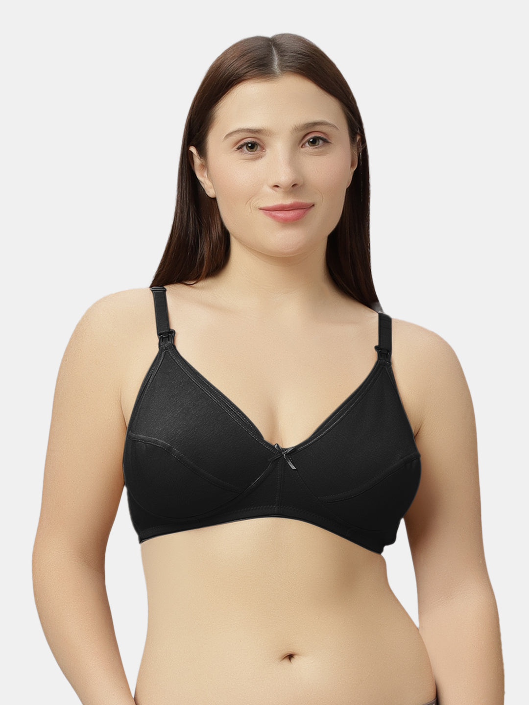 "The Tinycare Nursing Bra is thoughtfully designed for new and expecting mothers, combining comfort, functionality, and support. Crafted from stretch cotton with a soft PC interlock fabric, this bra ensures breathability and flexibility for all-day wear. Its non-padded, wire-free design provides gentle support and a natural shape, while the medium coverage offers a secure and comfortable fit.