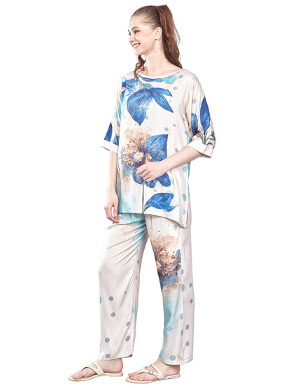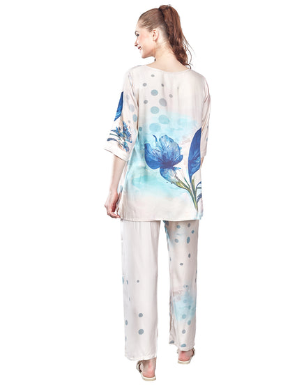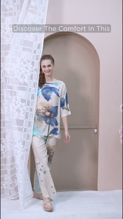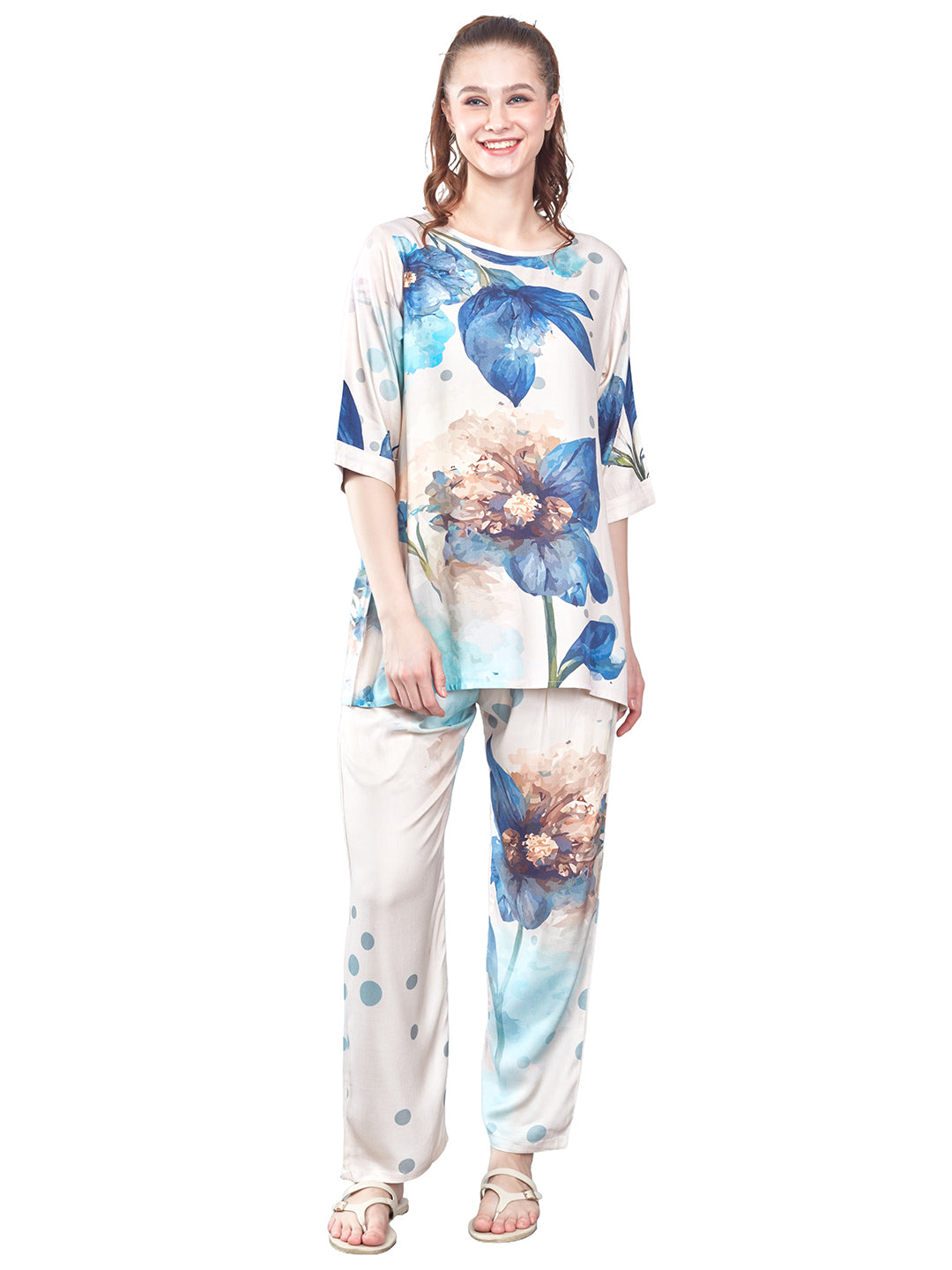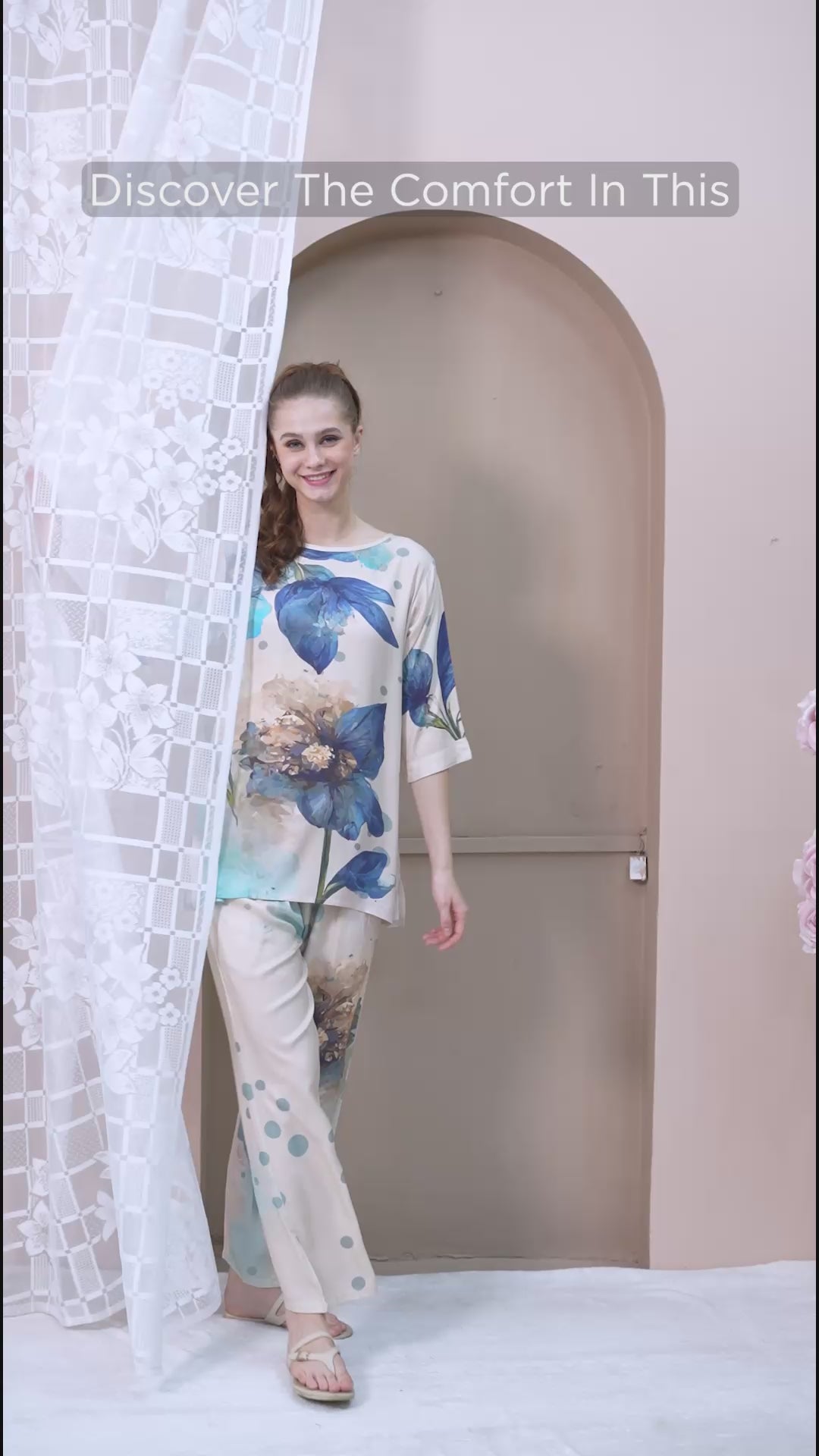 ● Paired with full-length pyjamas featuring a loose fit, elasticated waistband with matching drawcord, and convenient side pockets